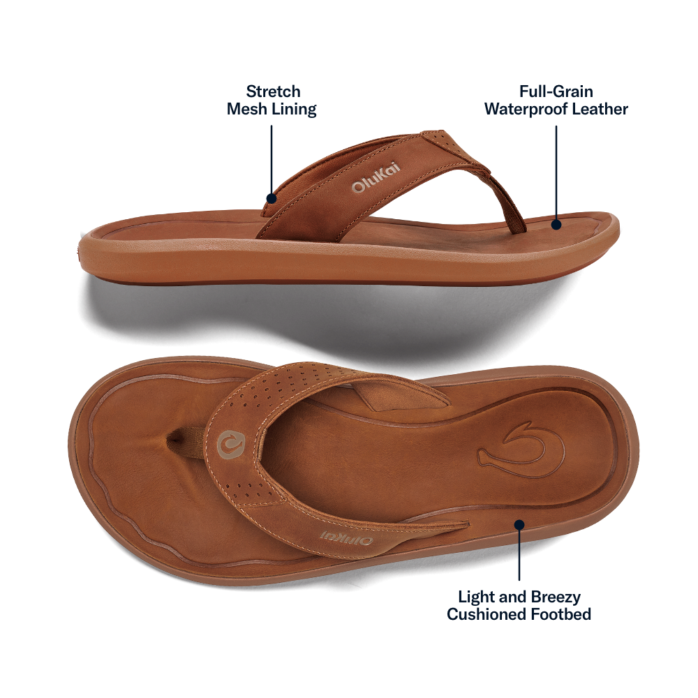 Designed with a lightweight feel and a sleek, low-profile shape, the Pili moves throughout your day. Its waterproof full-grain leather strap and kapa outsole are signatures of OluKai's superior craftsmanship, while the cushioned footbed keeps you comfortable all day.