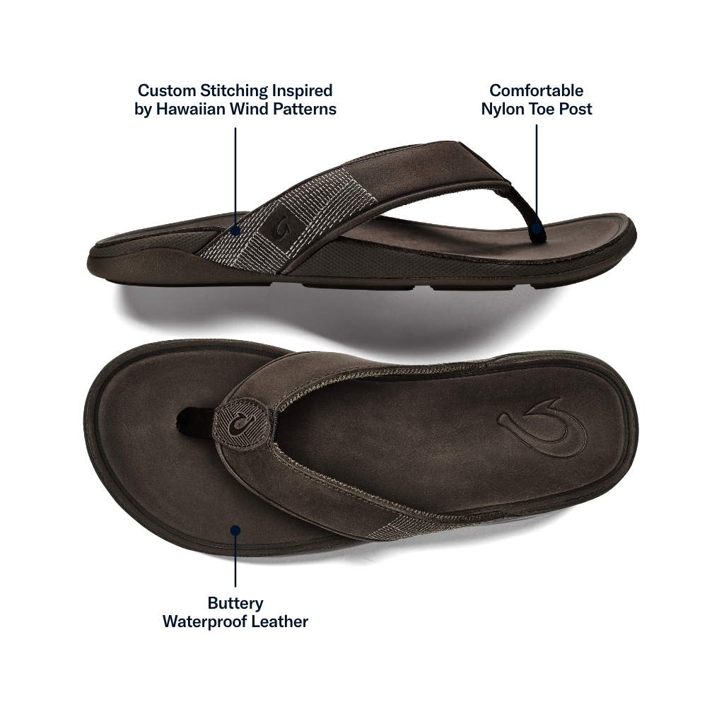The Tuahine elevates your everyday sandal experience. Designed for all-day wear, it offers all-day comfort and features waterproof leather, making it a versatile choice for any day's activities. Tuahine is perfect for strolling through town to relaxing by the beach. Distinctive details, such as custom upper stitching inspired by the cool Hawaiian winds, add a distinct touch of OluKai craftsmanship.